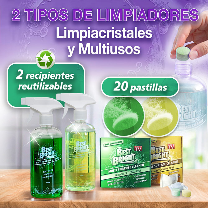 Además, incluye 10 pastillas del limpiacristales y limpiador de superficies más potente, y otras 10 del limpiador multiusos más eficaz. Solo tienes que llenar de agua sus 2 recipientes reutilizables, echar la pastilla que necesites ¡y no habrá quien te pare cuando quieras limpiarlo todo!