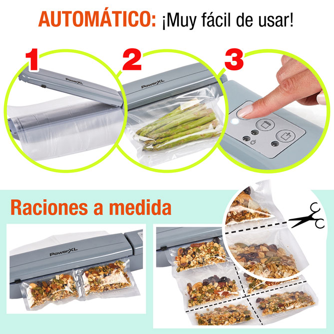 SellaVac PRO es muy sencilla. Sólo hay que cortar la bolsa al tamaño deseado, colocar los alimentos y pulsar un botón: automáticamente extrae el aire y el detector de presión se activa hasta sellarla de forma hermética. Además, incorpora una novedosa función “profesional”: el sistema de doble sellado superseguro que permite envasar líquidos al vacío y es perfecta para hacer raciones individuales de comidas, salsas… También sella en cualquier dirección ¡para personalizar tus envasados!