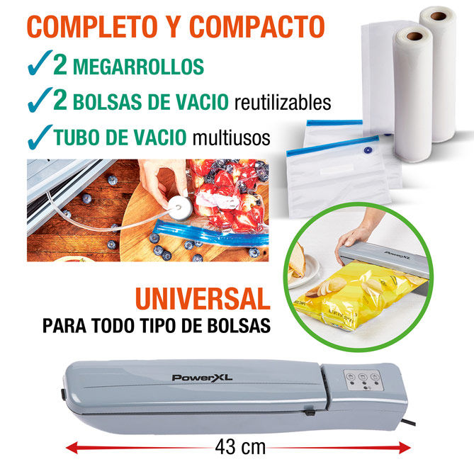 ¡Y eso no es todo! Ahora también va acompañada de estos fantásticos accesorios: un tubo de vacío y 2 bolsas de vacío reutilizables con válvula -mediana y grande-, para aprovechar aún más todas sus posibilidades, ¡totalmente gratis!