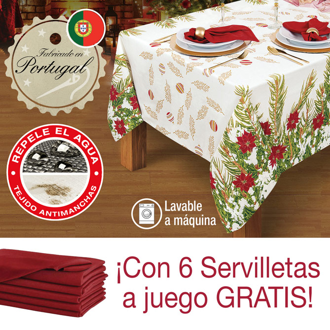 Con este Mantel podrás disfrutar de la emoción de preparar una bonita mesa de Navidad para los tuyos… ¡y olvidarte de quitarlo y lavarlo después de cada cena y comida! Porque su diseño navideño añadirá un toque de calidez a tus celebraciones y su tejido impermeable, con tratamiento antimanchas, te permitirá usarlo todas las fiestas simplemente pasando un paño húmedo para que quede como nuevo (aunque, por supuesto, también es lavable a máquina). Y es que, en estas fechas más que nunca, lo importante es que compartas risas, recuerdos y momentos únicos con tu familia y amigos… y no que estés pendiente de si una gota de vino se derrama en los brindis. Además, incluye 6 servilletas a juego ¡totalmente gratis!