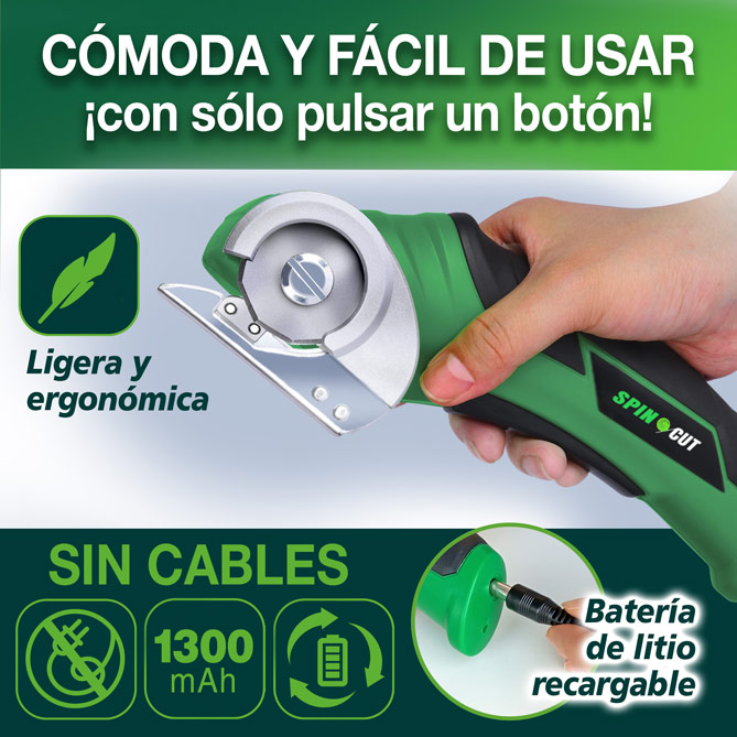 ¿Estás harto de luchar con tijeras sin filo o cúteres que desgarran el material? Con Spin Cut cortar se convierte en una tarea limpia, segura y cómoda. Su motor giratorio de alta potencia y su cuchilla autoafilable de acero resistente garantizan cortes precisos incluso en materiales gruesos. Funciona sin cables gracias a su batería recargable, y su diseño ergonómico y ligero se adapta perfectamente a la mano. Solo tienes que presionar el botón de seguridad, accionar el gatillo y dejar que Spin Cut haga el trabajo por ti. ¡Nunca dejarán de sorprenderte sus resultados!