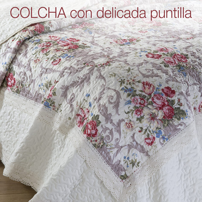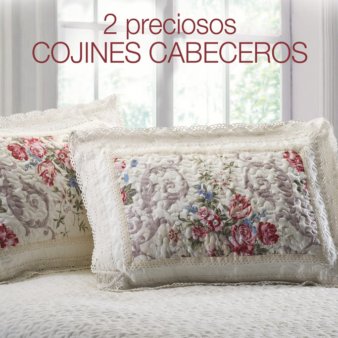 ¿Te imaginas despertar cada mañana entre suaves pétalos de las más bellas flores? Un sueño hecho realidad con el Conjunto BELLE ROSE. Su cuidado diseño de estilo clásico combina un estampado con grandes bouquets de rosas abiertas en todo su esplendor, pequeñas campánulas y románticos lirios de agua con una elegante cenefa y bellas puntillas. Te enamorarán sus vivos tonos rojos, burdeos, rosas, azules y verdes componiendo un alegre lienzo sobre una tela marfil de suave y cálido tacto… Te cautivarán su Colcha, sus 2 Cojines cabeceros y sus 3 Cojines decorativos de diferentes formas y medidas… Todos ellos confeccionados con mimo y maestría, mediante la prodigiosa técnica bouti que, combinadas con sus Sábanas bordadas a juego, van a convertir tu estancia más íntima en un espacio confortable, lleno de vida, optimismo y buen gusto, ¡digno de revista de decoración!