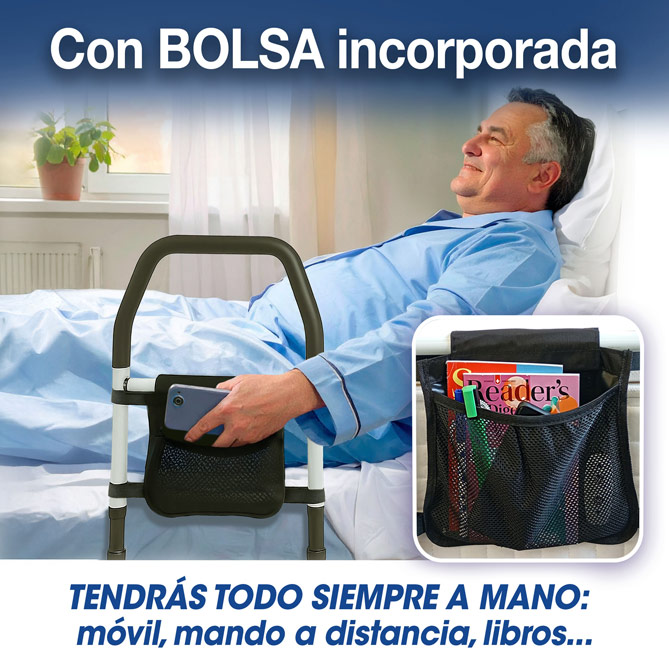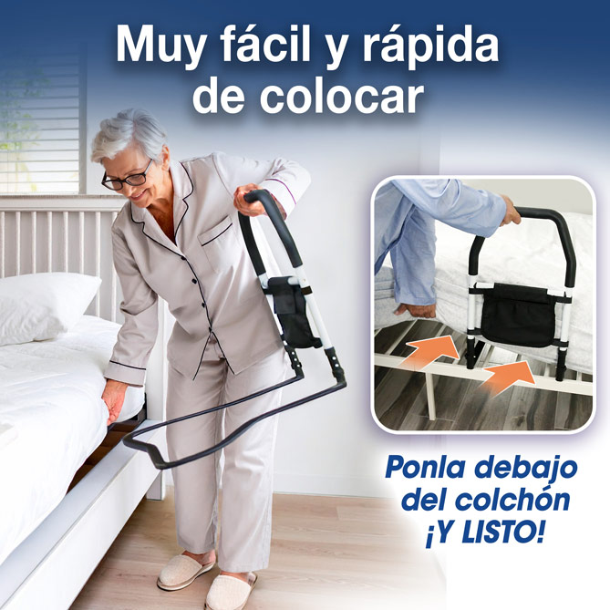 Si te preocupa que tus padres o abuelos puedan caerse al acostarse o levantarse de la cama, Bed Protect es la solución definitiva. Una barra de protección resistente, estable y pensada para dar apoyo real a quienes más lo necesitan. Gracias a su asa ergonómica y acolchada, permite sentarse, levantarse y acostarse sin esfuerzo, y moverse en la cama sin riesgo de caída. Su sistema de doble anclaje y gran superficie de apoyo la mantienen completamente firme bajo cualquier colchón, soporta más de 120 kilos, es regulable e incorpora un práctico bolsillo lateral para tener siempre a mano el móvil, gafas o medicamentos. No le falta detalle para proteger a las personas que más quieres.