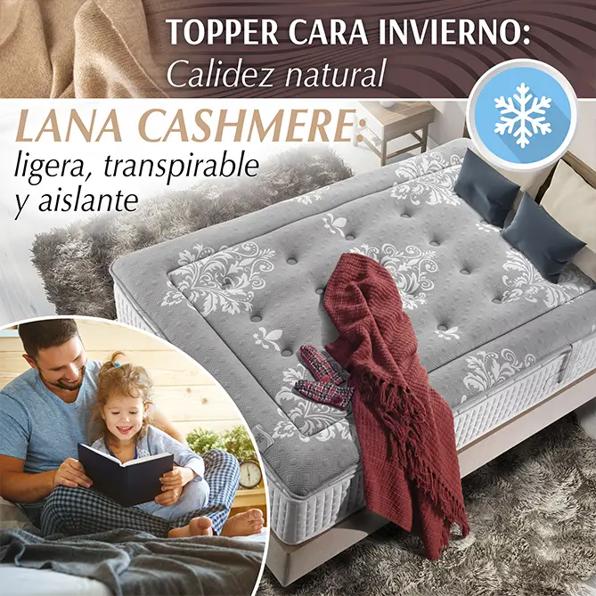 • LANA CASHMERE: la calidez natural más confortable del mundo. Ultrafina y ligera, transpirable e increíblemente aislante, el Cashmere es uno de los tejidos más lujosos, versátiles ¡y caros del mundo! Calentito en invierno, es perfecto para el lado “cálido” del Topper ÉLITE TERMODUAL; aunque en verano, gracias a su excepcional cualidad termorreguladora y su gran capacidad aislante, también es ideal. ¡Con este Colchón de lujo nunca te equivocas!