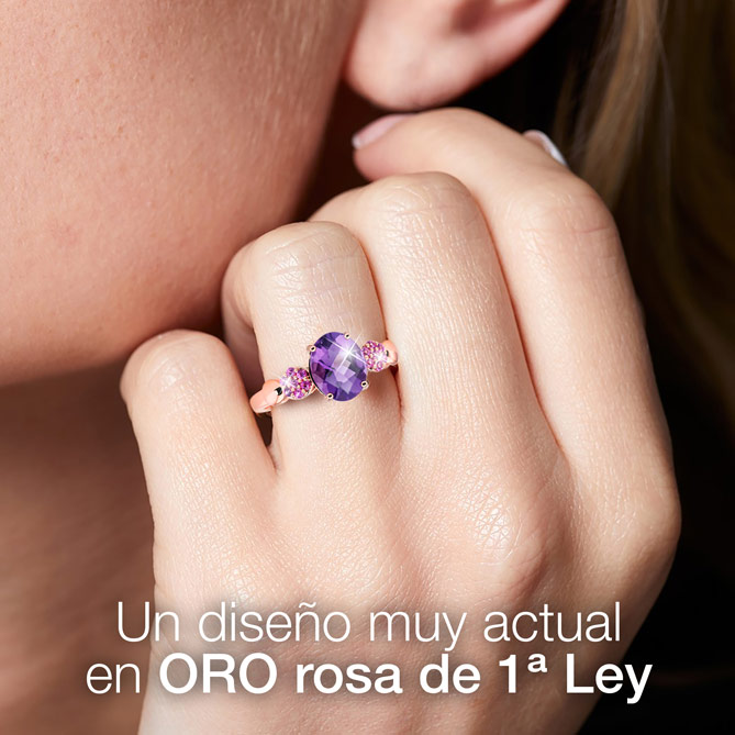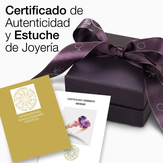 El Anillo BRIGITTE se entrega en un estuche de joyería con su Certificado de Autenticidad expedido por el International Gems and Diamond Institute, que garantiza la calidad y autenticidad de la Amatista y los Zafiros rosas utilizados en su creación. Además, lleva su correspondiente contraste oficial del Laboratorio de Ensayo y Contraste de Objetos de Metales Preciosos, que garantiza la pureza del Oro rosa de 1ª Ley.