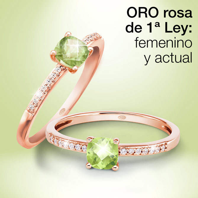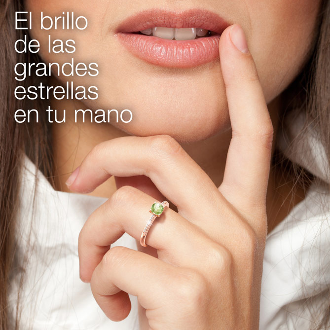 Disfruta del placer de lucir una joya llena de elegancia, sencillez y estilo. El maravilloso Anillo JENNIFER, con un luminoso Peridoto central de más de medio Quilate y 14 espléndidos Diamantes sobre Oro rosa de 1ª Ley, es un diseño que combina las últimas tendencias de la Alta Joyería y los materiales preciosos más deseados. ¡Un anillo que brilla con luz propia!