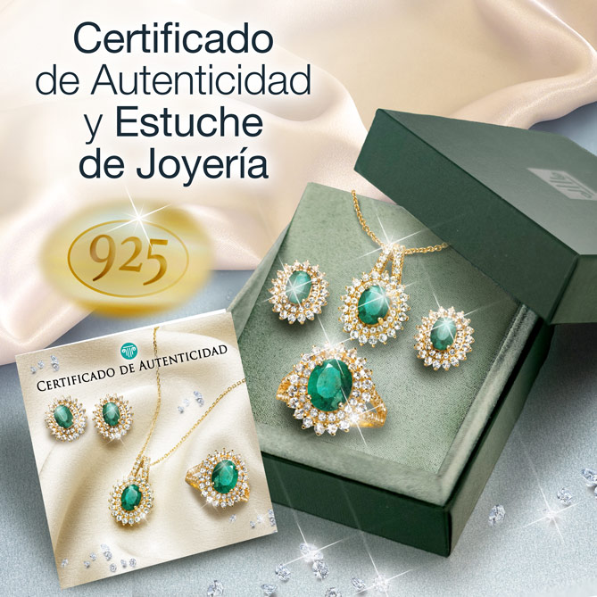 Un exquisito Colgante con cadena, unos Pendientes super-elegantes y un Anillo espectacular: el Conjunto LUJO ESMERALDA es perfecto si amas la Alta Joyería. 4 Esmeraldas -¡con un peso total de 5 Quilates!- y 182 Topacios iluminan este diseño exclusivo. 8,90 Quilates de Piedras Preciosas brillando sobre Plata de 1ª Ley bañada en Oro amarillo de 1ª Ley reunidas en 3 joyas que son un verdadero “fondo de joyero”: imprescindibles para todas las mujeres que tienen la elegancia como bandera. ¿Quién dijo que la Alta Joyería no era asequible?