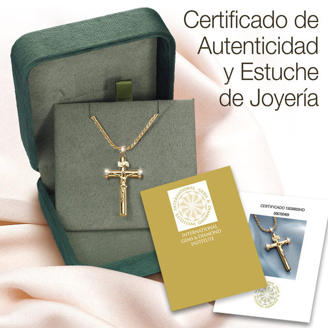 La Cruz ESENCIA y su Cadena a juego se entregan en un elegante estuche de Joyería, acompañadas de su Certificado de Autenticidad, expedido por el International Gems & Diamond Institute, que garantiza la calidad y autenticidad de los Topacios y los Diamantes empleados en su creación. Lleva además su correspondiente contraste oficial del Laboratorio de Ensayo y Contraste de Objetos de Metales Preciosos, que garantiza la pureza de la Plata de 1ª Ley –a la que se ha aplicado un chapado de Oro amarillo de 1ª Ley de Alta Joyería, de la mejor calidad para asegurar su brillo inalterable–.