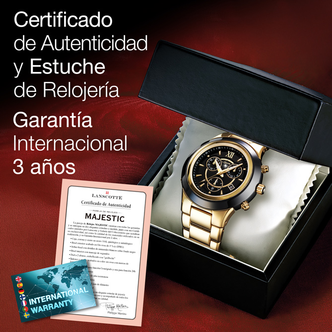 El hombre de hoy sabe lo que quiere. Y lo quiere es siempre lo mejor. Como el nuevo Reloj MAJESTIC, de la prestigiosa firma suiza Lanscotte. Exígele todo, que todo te lo dará. ¿Los mejores materiales? Cerámica negra ultrarresistente, Acero bañado en Oro de 1ª Ley IPG y 1 genuino Diamante. ¿Diseño exclusivo? A la medida del caballero del siglo XXI. ¿Precisión modélica? Su mecanismo montado a mano nunca te fallará. Y ahora es cuando tú piensas que un Reloj así tiene un coste prohibitivo. Pero no. MAJESTIC está a tu alcance. Sería una pena que lo dejaras escapar…