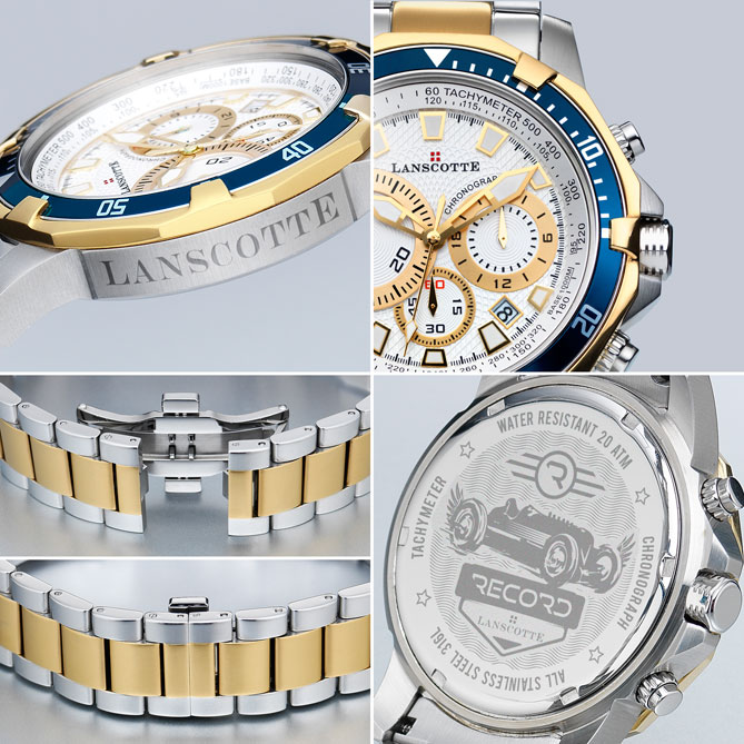 Inspirado en los pilotos más elegantes y bravos de la historia, nace el Reloj Cronógrafo RECORD. El lujo de sus materiales es una victoria segura: 100% Acero 316L, quirúrgico y antialérgico, con baño selectivo en Oro de 1ª Ley IPG, de brillo y fuerza inalterables. Alta Relojería que marca la diferencia gracias, también, a su espíritu deportivo: cronógrafo de alta precisión, taquímetro de fácil uso para medir velocidades, impresionante dial multinivel, resistencia al agua 20 ATM para su uso sin importar lo inhóspito del clima o entorno, bisel en color azul, trasera exclusiva de aire vintage… Todo, con la calidad que solo los relojeros de Lanscotte son capaces de imprimir a sus obras. Para que disfrutes con intensidad del emocionante viaje que es la vida.