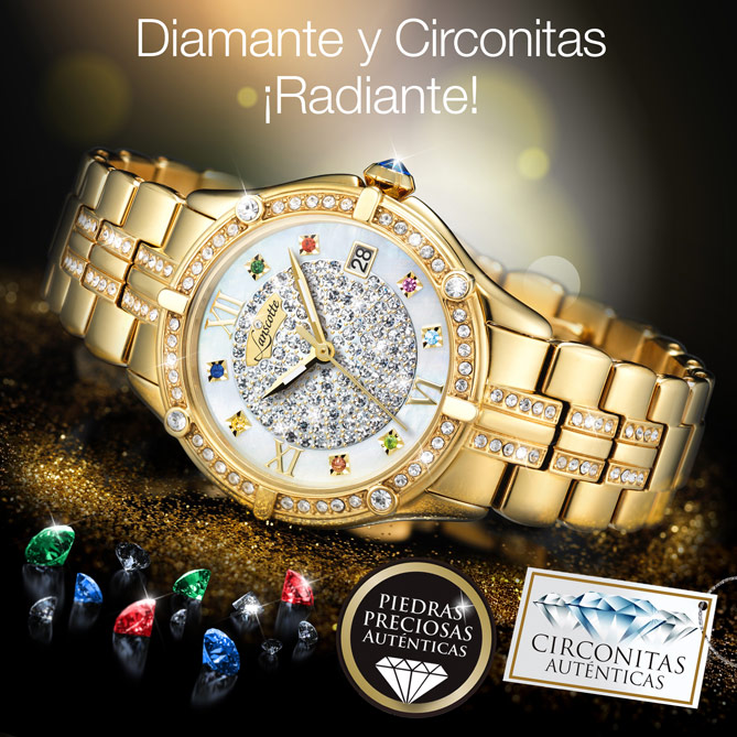 La composición es magnífica. Las Circonitas -de asombrosa similitud visual con el Diamante- también entregan su fulgor en el bisel y el brazalete, mientras que 1 auténtico Diamante -escogido por su pureza- en el dial y 1 sensacional Zafiro en la corona completan un Reloj sencillamente espectacular. LUXURY hace honor a su nombre.