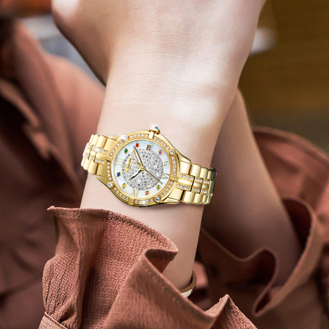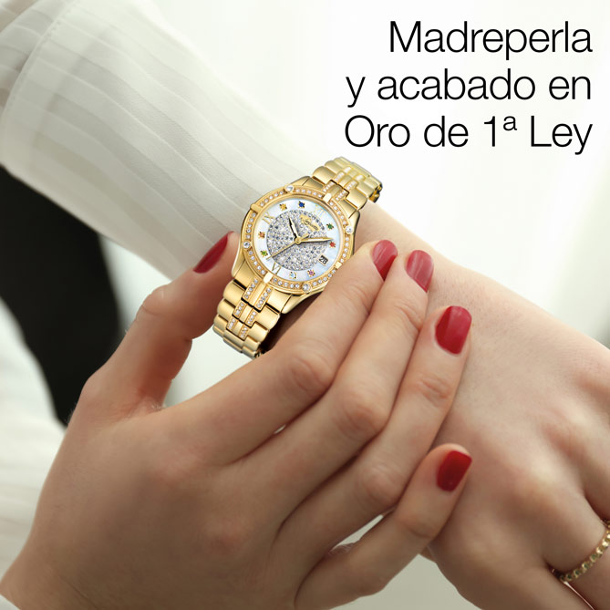 Sucede en contadas ocasiones: relojes tan exquisitos que todos reconocen como pequeñas obras de arte. LUXURY es uno de ellos: su caja redonda -un clásico ajeno a las fugaces modas-, acoge el caleidoscopio más glamuroso: un dial de Madreperla, cuajado de Circonitas en su parte central, con los numerales más fascinantes que puedas imaginar, las Piedras Preciosas y Semipreciosas que toda dama sueña poseer... Zafiro, Esmeralda, Rubí, Amatista, Aguamarina, Topacio amarillo, Citrino y Peridoto compitiendo en luminosidad para que luzcas radiante y cada gesto de tu mano sea poesía en movimiento.